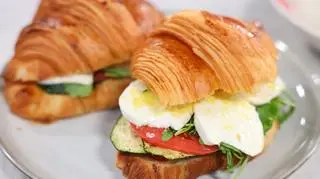 Przekrój croissanty na pół i delikatnie podsmaż wszystkie połówki na rozgrzanej patelni z oliwą. Pokrój paprykę, cukinię i czosnek w plastry, a oliwki przekrój na pół. Warzywa podsmaż na oliwie, aż staną się miękkie. Pokrój mozzarellę i pomidora w plastry. Na dolne połówki croissantów ułóż po kolei rukolę, bazylię, mozzarellę, pomidora i podsmażone warzywa. Wierzch posyp skórką i polej sokiem z cytryny. Całość przykryj górnymi połówkami croissantów.