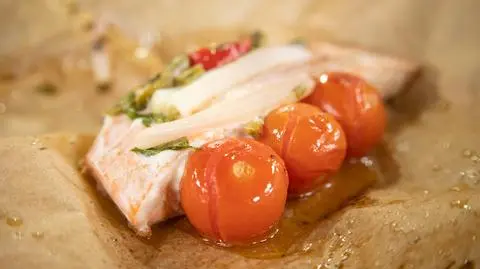 - Łososia natrzyj pozostałością oliwy, skórką z cytryny oraz solą i pieprzem. Jeżeli udało Ci się dostać jabłuszka kaparowe, obłóż nimi rybę, a z jednego wyciśnij sok i skrop nim łososia. Rybę ułóż na warzywach i wstaw do piekarnika.